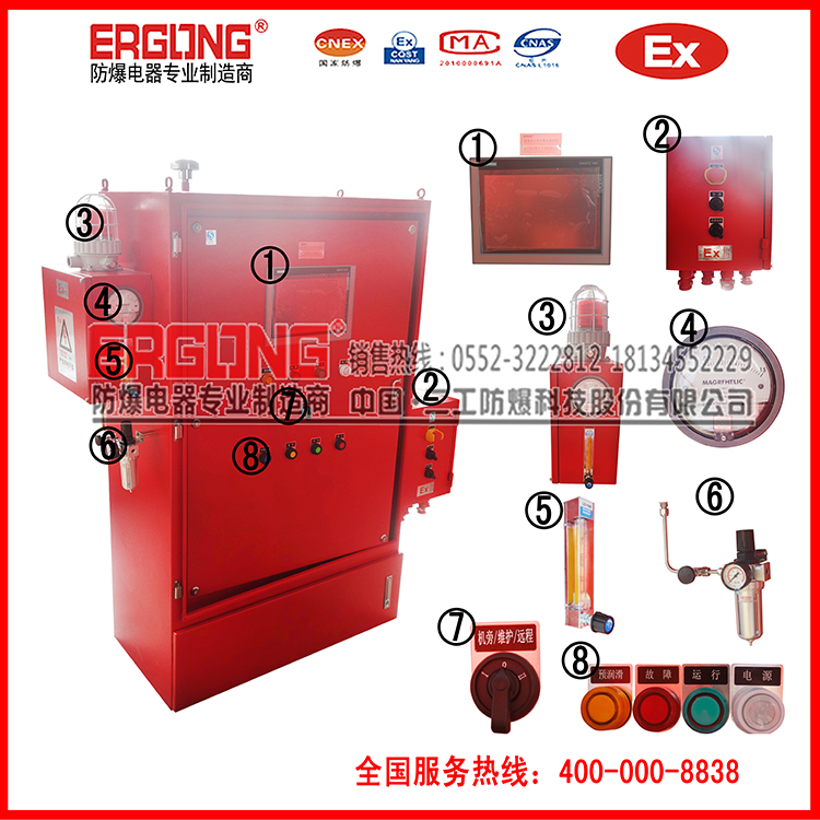 4.防爆配电柜由柜体、控制系统、布气系统、报警系统、配电系统组成;正压腔内装部分控制系统的防爆元件及用户的配电系统元件(也可根据客户要求订做分体式或联机式);