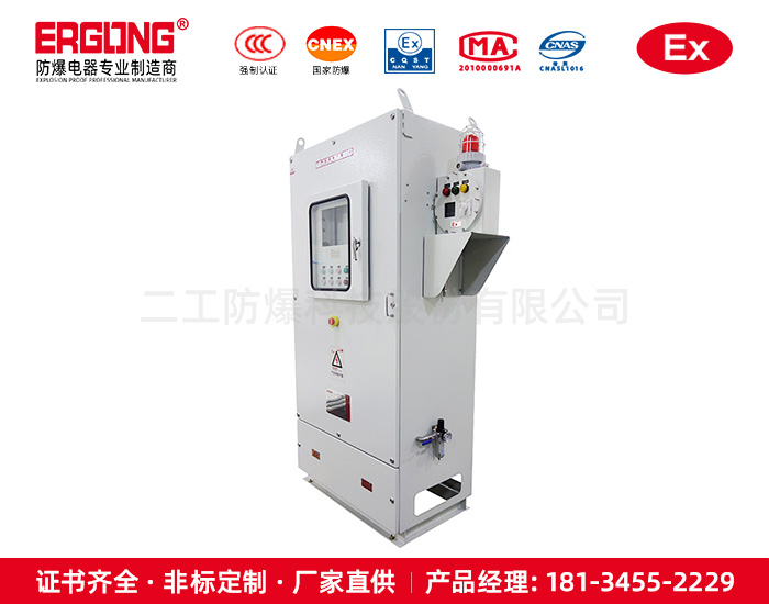 4. 配电柜由柜体、控制系统、布气系统、报警系统、配电系统组成;正压腔内装部分控制系统的防爆元件及用户的配电系统元件(也可根据客户要求订做分体式或联机式);