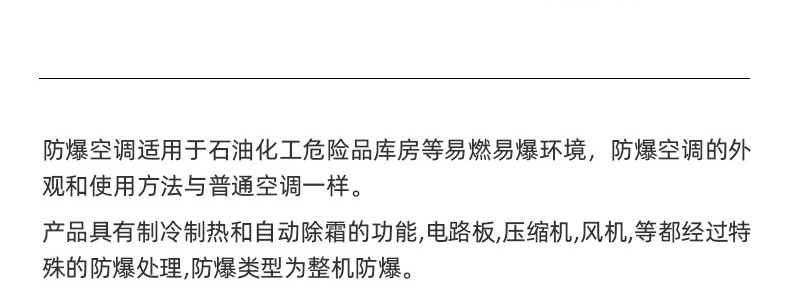 产品具有制冷制热和自动除霜功能,压缩机、风机等都经过特殊的防爆处理,防爆类型为整机防爆。防爆产品可应用于石油、危险仓库等易燃易爆的混合性气体环境中使用。在结构上采用隔爆型、本安型、浇封型等复合防爆技术,控制端全由本安型控制,不产生任何电火花,使用方便安全,采用高效多翅式换热器,冷煤通过时与空气的接触更充分,能大幅度的提高空调的制冷制热效果,手动控制和遥控两种。防爆空调未取得生产许可证不得生产及销售。