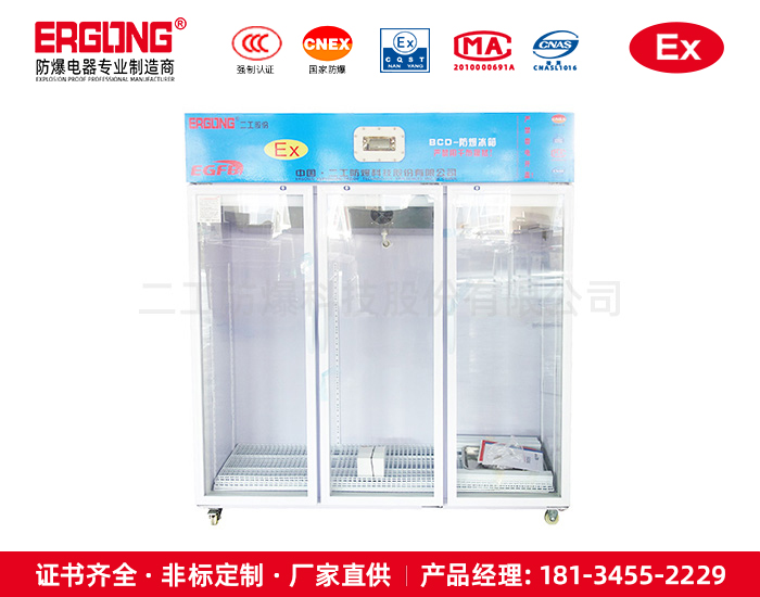 化验室防爆冰箱主要应用在石油、化工、军事、医药、科研、实验室等领域,用于在较低温度下冷却储存药品试剂等常温下不易保存易挥发易燃易爆危险物品。按其结构分有单门、双门和多门及卧式、立式之分。它由制冷压缩机、冷凝器、冷凝器风机、蒸发器、温度控制器组成。为使其能在危险场所安全使用,我们同样采用复合防爆技术对冰箱进行防爆处理。压缩机、冷凝风机采用浇封或隔爆技术处理,温控器作为一个无源开关与防爆有源光耦固态继电器组成本质安全型温度自动控制系统。为保护压缩机不致损坏,采用延时型防爆固态继电器和过载保护及热保护器件,部分控制电器采用隔爆处理。为了防止静电所带来的危害,对冰箱内腔喷涂导电漆消除静电效应,使用更安全。