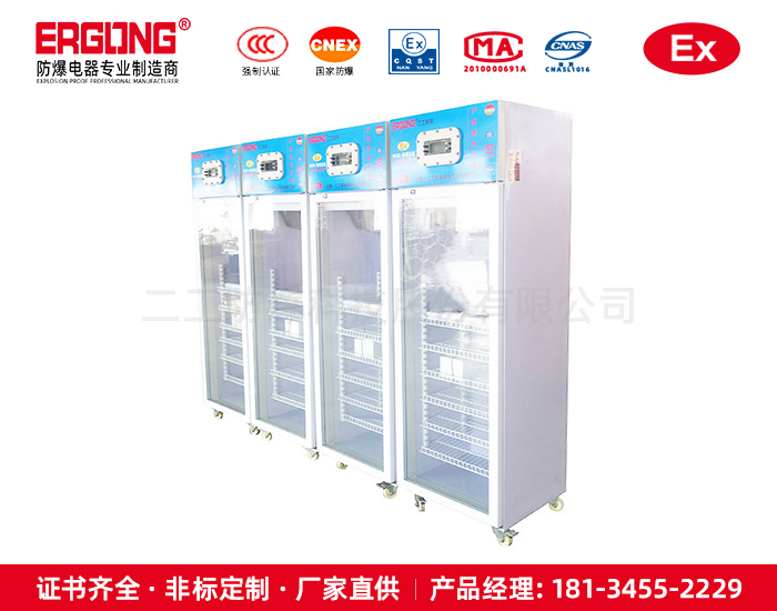 防爆低温保鲜柜主要应用在石油、化工、军事、医药、科研、实验室等领域,用于在较低温度下冷却储存药品试剂等常温下不易保存易挥发易燃易爆危险物品。按其结构分有单门、双门和多门及卧式、立式之分。它由制冷压缩机、冷凝器、冷凝器风机、蒸发器、温度控制器组成。为使其能在危险场所安全使用,我们同样采用复合防爆技术对冰箱进行防爆处理。压缩机、冷凝风机采用浇封或隔爆技术处理,温控器作为一个无源开关与防爆有源光耦固态继电器组成本质安全型温度自动控制系统。为保护压缩机不致损坏,采用延时型防爆固态继电器和过载保护及热保护器件,部分控制电器采用隔爆处理。为了防止静电所带来的危害,对冰箱内腔喷涂导电漆消除静电效应,使用更安全。