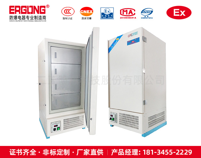 防爆冰箱冷藏血站血液储存主要应用在石油、化工、军事、医药、科研、实验室等领域,用于在较低温度下冷却储存药品试剂等常温下不易保存易挥发易燃易爆危险物品。按其结构分有单门、双门和多门及卧式、立式之分。它由制冷压缩机、冷凝器、冷凝器风机、蒸发器、温度控制器组成。为使其能在危险场所安全使用,我们同样采用复合防爆技术对冰箱进行防爆处理。压缩机、冷凝风机采用浇封或隔爆技术处理,温控器作为一个无源开关与防爆有源光耦固态继电器组成本质安全型温度自动控制系统。为保护压缩机不致损坏,采用延时型防爆固态继电器和过载保护及热保护器件,部分控制电器采用隔爆处理。为了防止静电所带来的危害,对冰箱内腔喷涂导电漆消除静电效应,使用更安全。