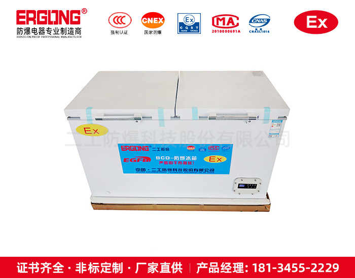 防爆冰箱研究院化学品存放主要应用在石油、化工、军事、医药、科研、实验室等领域,用于在较低温度下冷却储存药品试剂等常温下不易保存易挥发易燃易爆危险物品。按其结构分有单门、双门和多门及卧式、立式之分。它由制冷压缩机、冷凝器、冷凝器风机、蒸发器、温度控制器组成。为使其能在危险场所安全使用,我们同样采用复合防爆技术对冰箱进行防爆处理。压缩机、冷凝风机采用浇封或隔爆技术处理,温控器作为一个无源开关与防爆有源光耦固态继电器组成本质安全型温度自动控制系统。为保护压缩机不致损坏,采用延时型防爆固态继电器和过载保护及热保护器件,部分控制电器采用隔爆处理。为了防止静电所带来的危害,对冰箱内腔喷涂导电漆消除静电效应,使用更安全。