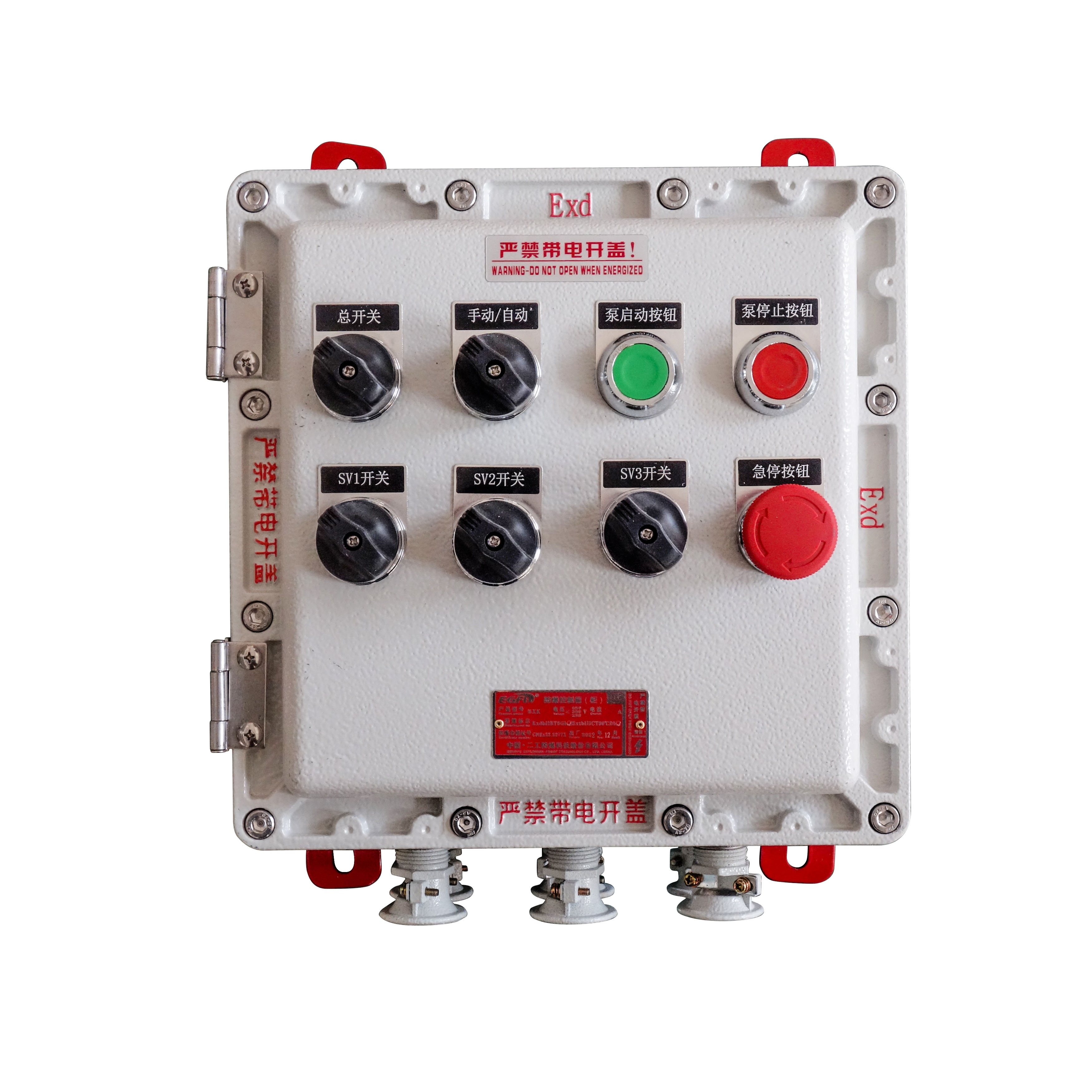 防爆控制箱主要用于控制照明系统的配电箱和控制动力系统的动力防爆箱。一般用于含有爆炸性的危险场所,内部配置有断路器,接触器,热继电器,转换开关,信号灯,按钮等元件,元件品牌可根据用户需求进行选配。