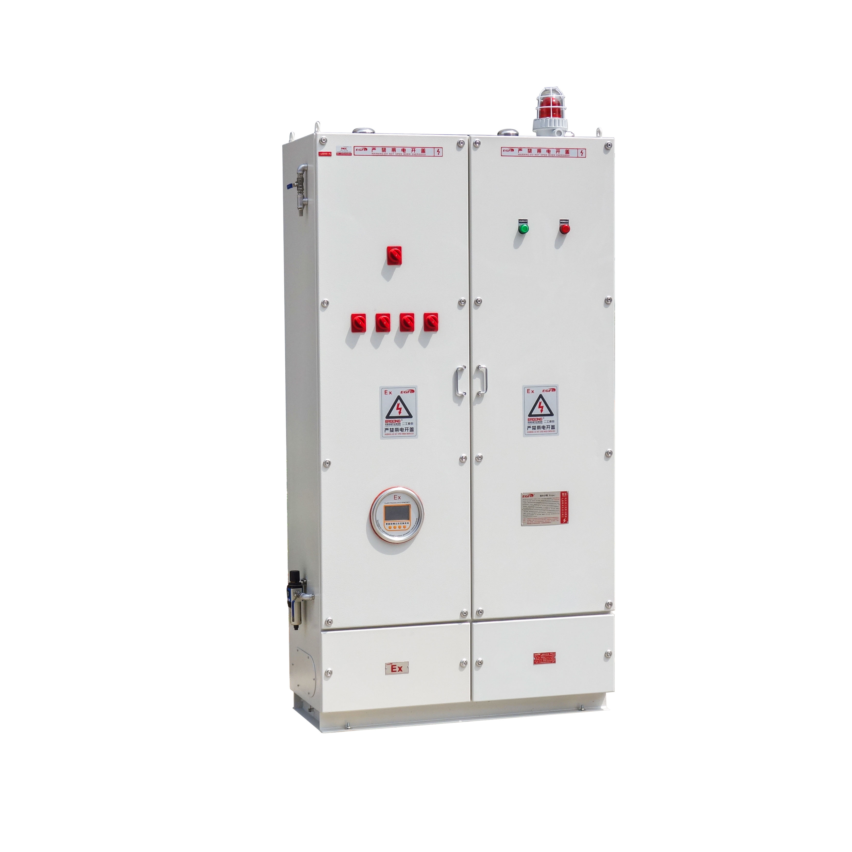 防爆正压柜:防爆正压柜是一种保护电气设备免受危险环境中爆炸性气体、蒸汽或粉尘侵入的装置。它采用正压原理,通过在柜内维持一个较高的内压,阻止有害物质进入,并确保柜内电气设备的正常运行。