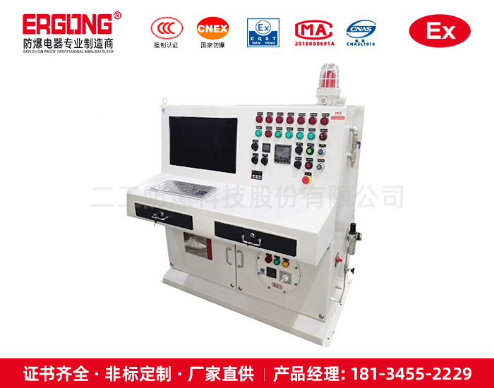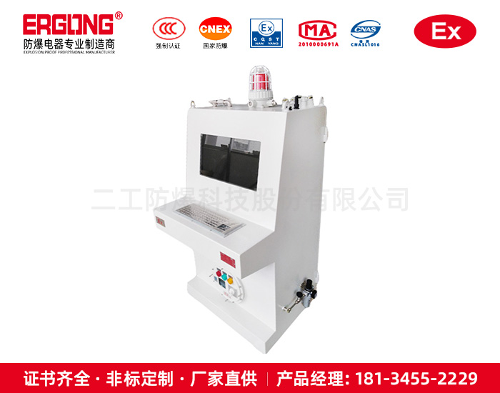 在一个几乎密封的箱体里,不间断的供气,气源压力0.2-1.8兆帕,通入的气体为仪表风或者空压机压缩空气或者氮气(严禁通入爆炸性气体)经过正压调节,使压力控制在350帕左右,原理是内部的气体压力大于箱外的气体压力,使周边的爆炸性气体进不了箱体,来达到防爆的要求,箱外可以装普通的控制元件或者触摸屏,各种仪器仪表,对于客户要求装的元件基本不受限制。