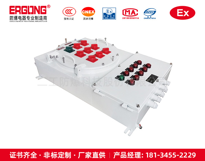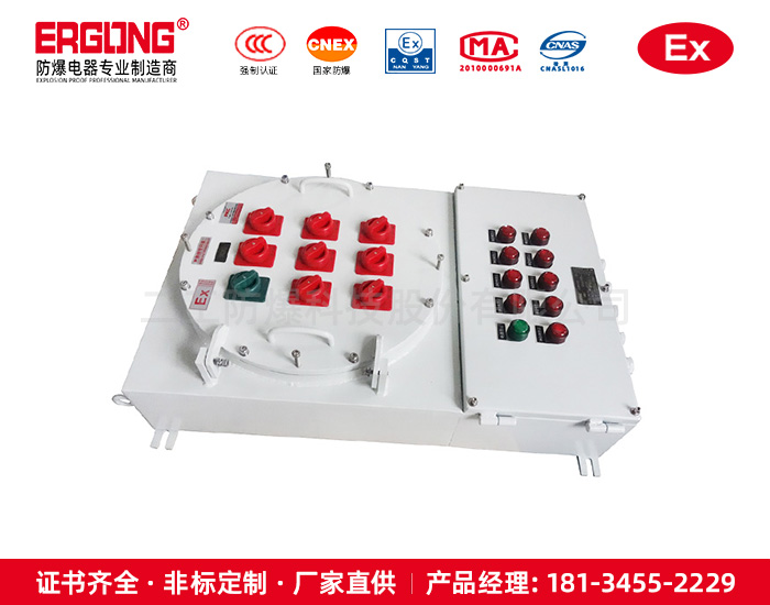 1.防爆配电箱外壳采用ZL102铝合金压铸或钢板焊接成型,表面高压静电喷塑,配不锈钢外露紧固件,产品外形美观。 2.防爆配电箱设计精良,安全易用,我公司免费提供一年保 3.箱体图纸可由贵公司提供,或由我公司代为制作。 4.防爆照明(动力)配电箱采用复合型,模块结构,各回路可根据需要自由组装,一般开关箱采用隔爆型结构,母线箱及出线箱采用增安型结构。 5.内装元件可根据用户要求安装高分断路器或塑壳式断路器。如DZ47、C65、CM1等。 6.可根据客户要求特制,如加装电涌保护器、电流表、电压表等,外可配挂锁金属手柄。 7.适用于照明和动力线路,具有分断、过载、失压保护和短路自动切断功能钢管或电缆布线均可。 8.符合GB3836-2000,IEC60079标准要求。
